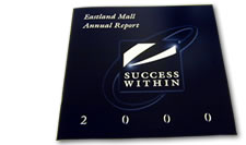 Client: Creative Source Design Group Project: Eastland Mall Annual Report Quantity: 300 12 page, self-cover Binding: saddle-stitch Flate size: 8.5 x 8.5 Covers: black, 294 blue, gloss varnish Text: black, 294 blue Stock: McCoy Silk, 80# cover